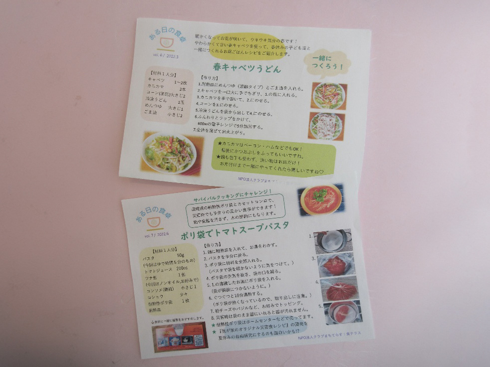 安心できる食生活のためにできる事を、主に子育て世代に向けて、日常から被災時までを視野に入れて様々なレシピや情報を発信しています。年4回発行の“キラ星通信”内にレシピコーナーを設けているほか、レシピを自由にお持ちいただけるよう子どもステーション室内にも設置しております。